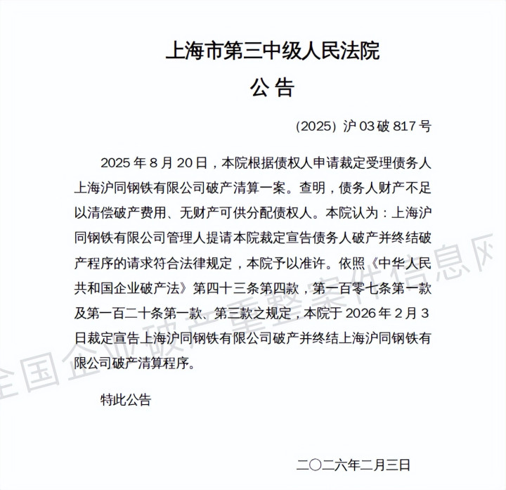此前,全国企业破产重整案件信息网在2月4日,公开了(2025)沪03破817号破产终结案件,上海市第三中级人民法院正式公告,上海沪同钢铁有限公司被裁定宣告破产并终结破产清算程序。