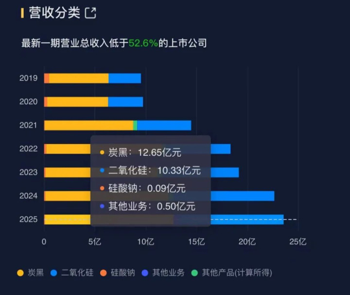 2025年,联科科技炭黑、二氧化硅的收入分别为12.65亿元、10.33亿元,分别占比54%、44%。