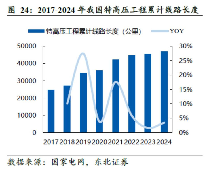 特高压工程的持续推进是推动行业增长的核心驱动力。根据东北证券数据,2017-2024年间,我国特高压工程累计线路长度持续增长。特高压作为“十四五”收官之年的重点,预计全年核准“四直四交”,投资额达1120亿,同比增长34%。